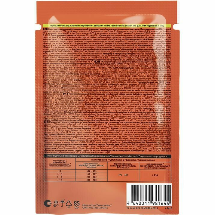 Влажный корм для кошек proхвост с цыпленком и перепелом в желе с овощами сашет 85 г 28шт информация: