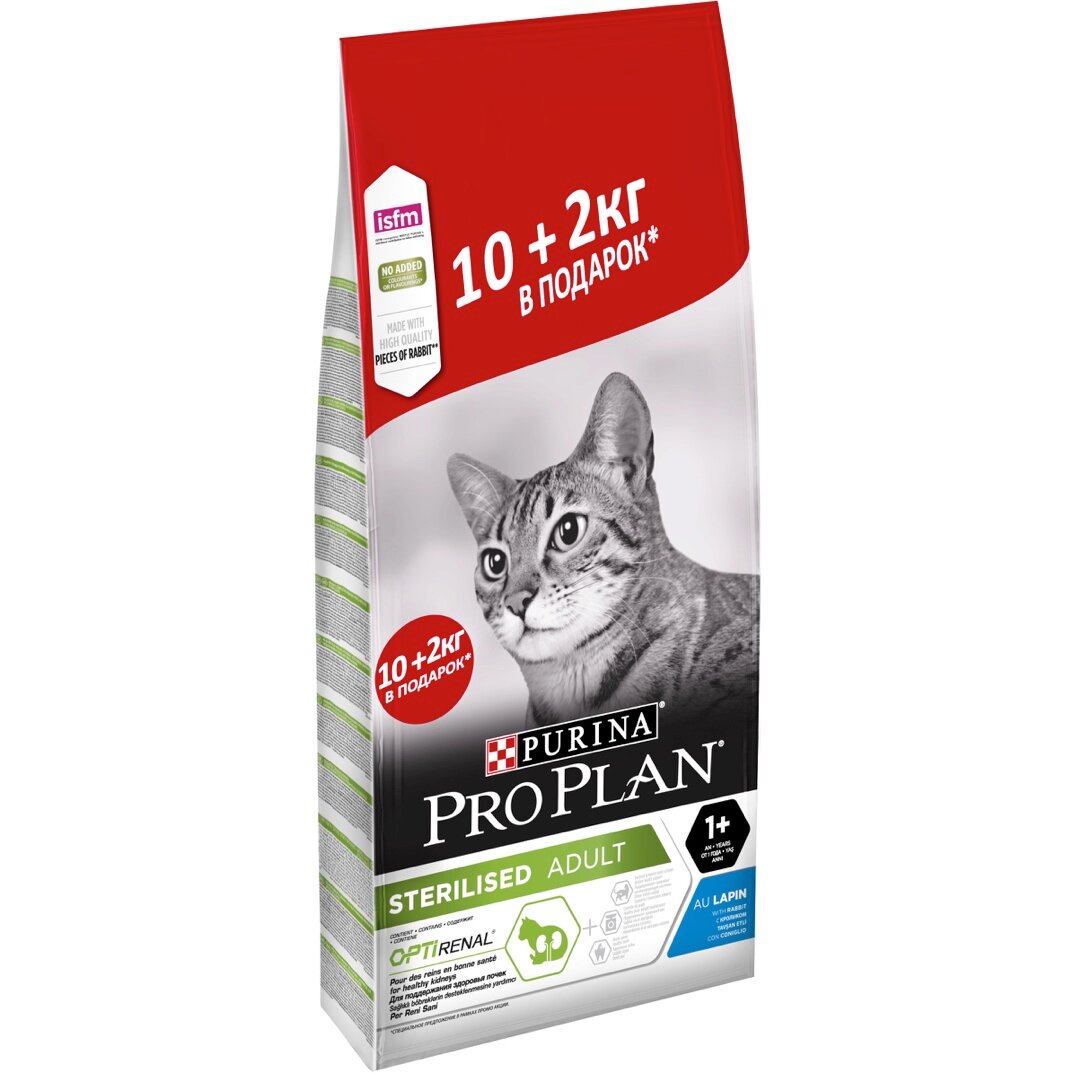 10 цен на Корм PRO PLAN Sterilised OPTI DIGEST (комплекс для поддержания здорового пищеварения) для стерилизованных кошек, с курицей, 10 кг+2 кг в подарок)