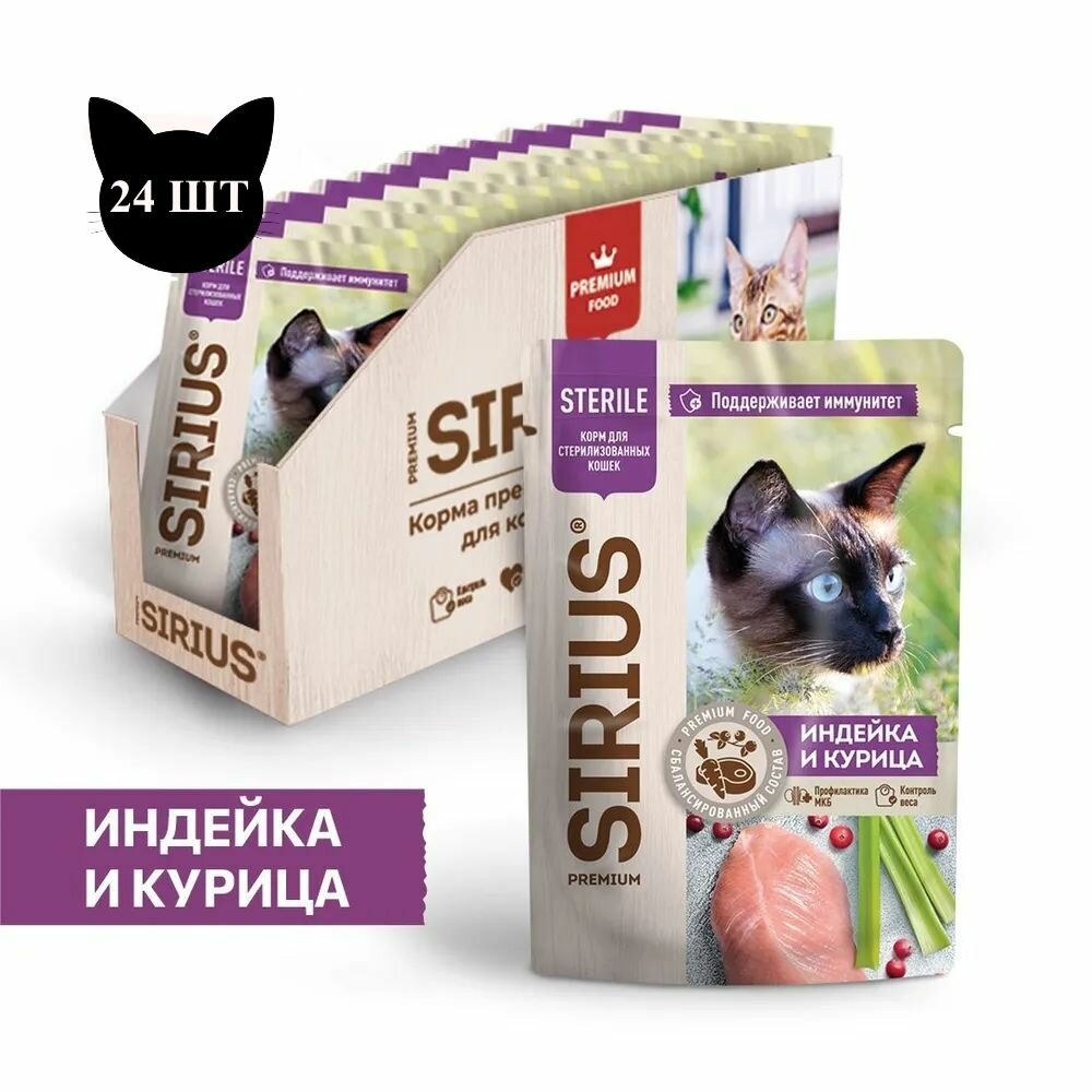 10 цен на Влажный корм SIRIUS для кастрированных котов и стерилизованных кошек, индейка и курица, пауч, 85гр*24шт