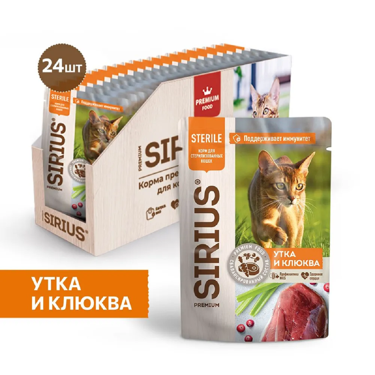 10 цен на Влажный корм SIRIUS для кастрированных котов и стерилизованных кошек, утка с клюквой, пауч, 85гр*24шт
