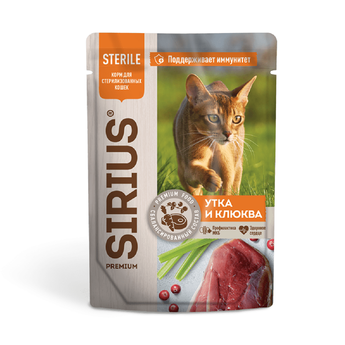 Влажный корм SIRIUS для кастрированных котов и стерилизованных кошек, утка с клюквой, пауч, 85гр*24шт информация: