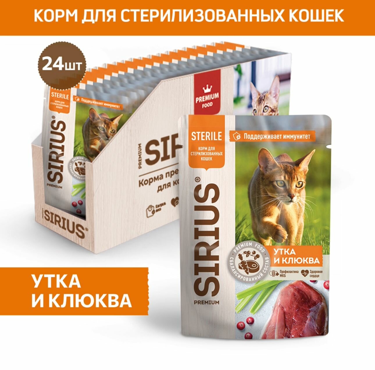 Влажный корм SIRIUS для кастрированных котов и стерилизованных кошек, утка с клюквой, пауч, 85гр*24шт 1 560 ₽