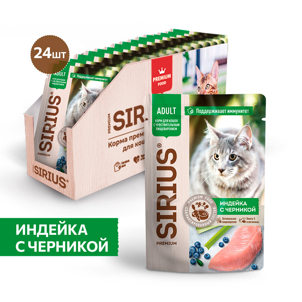 Влажный корм SIRIUS для кошек с чувствительным пищеварением, кусочки в соусе, индейка с черникой, 85 гр * 24 шт 1 632 ₽