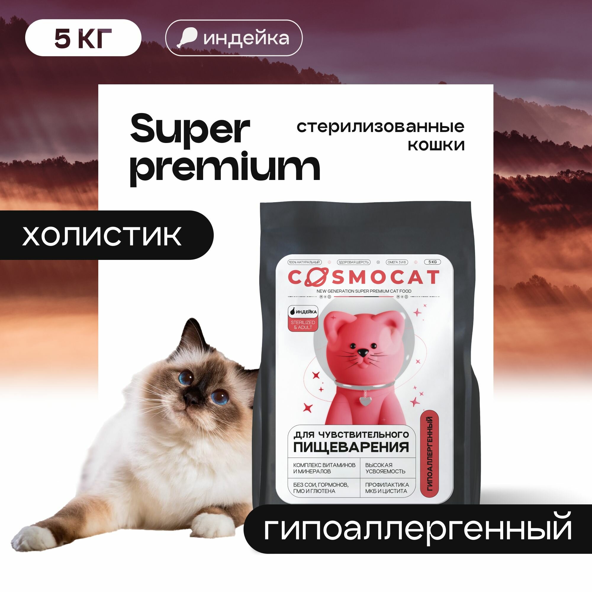 Корм для кошек сухой Cosmocat для стерилизованных гипоаллергенный с индейкой, 5 кг информация: