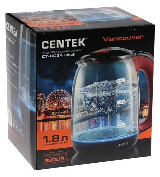 Чайник CENTEK CT-0034 Black Vancouver (1.8л, стекло, LED-подсветка)