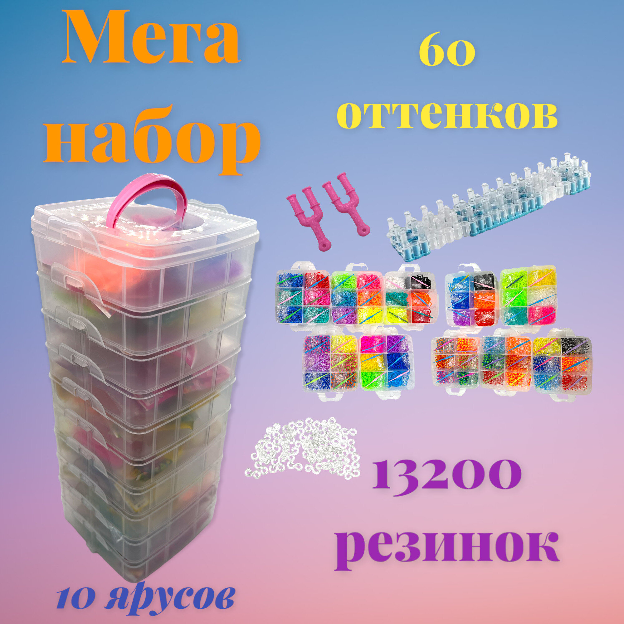 10 цен на Набор резинок для плетения браслетов 13200 резинок, 10 ярусов, разноцветные,крючки(станок НЕ входит В комплект)