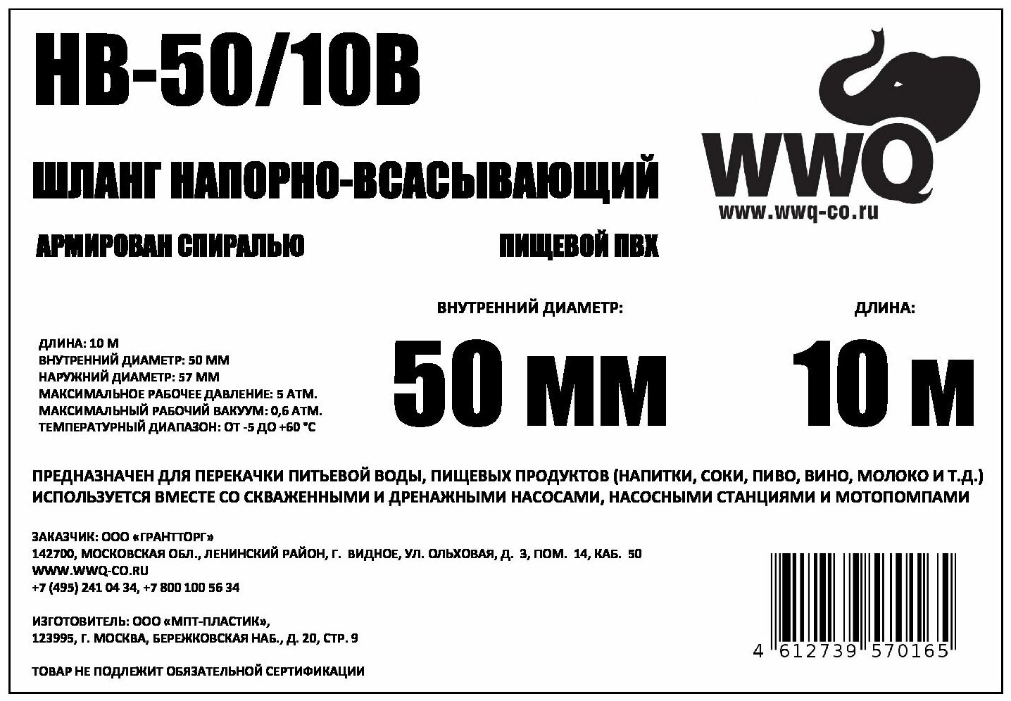 WWQ Напорно-всасывающий шланг HB-50/10B информация:
