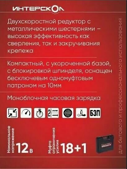 Дрель-шуруповерт аккумуляторная ИНТЕРСКОЛ ДА-12ЭР промо (12В, 2акк*2Ач Li-ion, 28Нм, подсветка, 1кг, экокейс) информация: