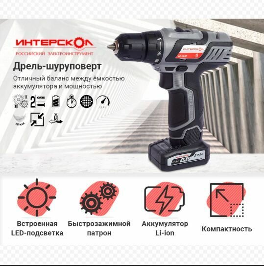 Отзывы на Дрель-шуруповерт аккумуляторная ИНТЕРСКОЛ ДА-18ЭР промо (18В, 2акк*2Ач Li-ion, 35Нм, 2скорости, подсветка, 1,1кг, экокейс)