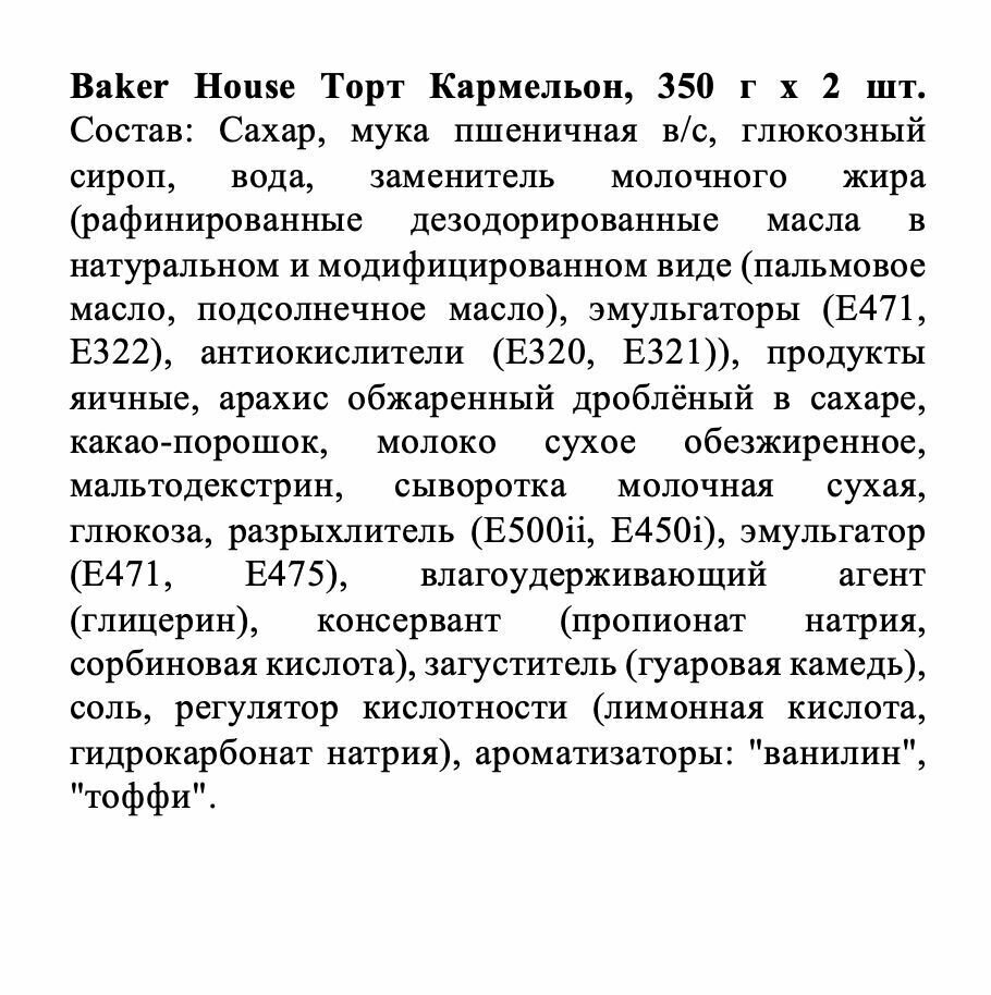 Торт "Кармельон" бисквитный трехслойный "Baker House" 350г х 2шт информация: