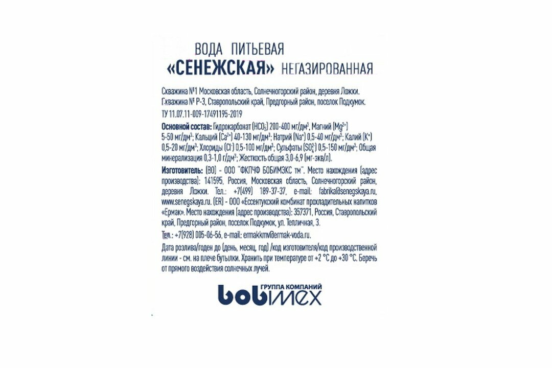 Вода минеральная питьевая Сенежская негазированная, ПЭТ, без вкуса, 0.5 л информация:
