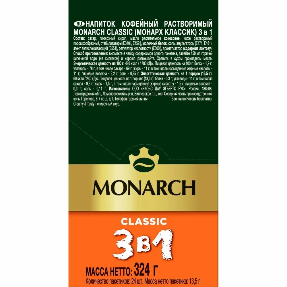 Напиток кофейный растворимый MONARCH 3 в 1 Классика, в стиках, 24 уп., 324 г