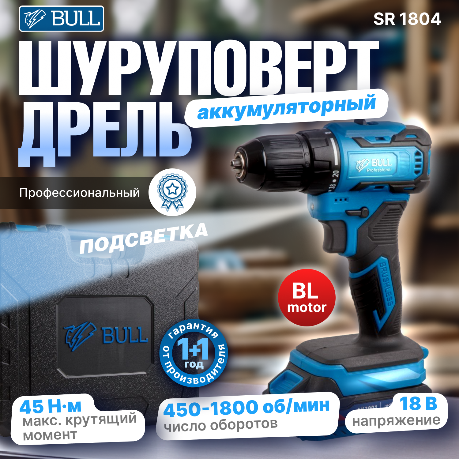 Дрель-шуруповерт аккумуляторная BULL SR 1804 (1329421) 10 990 ₽