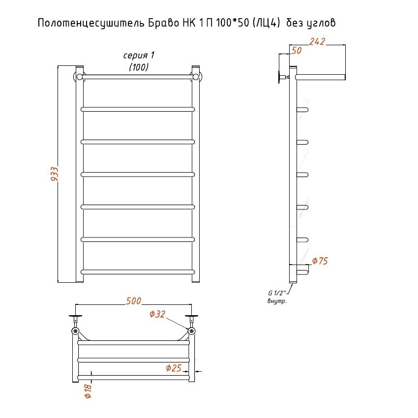 Полотенцесушитель Браво НК 1 П 100*50 (ЛЦ4) с полкой, без углов информация: