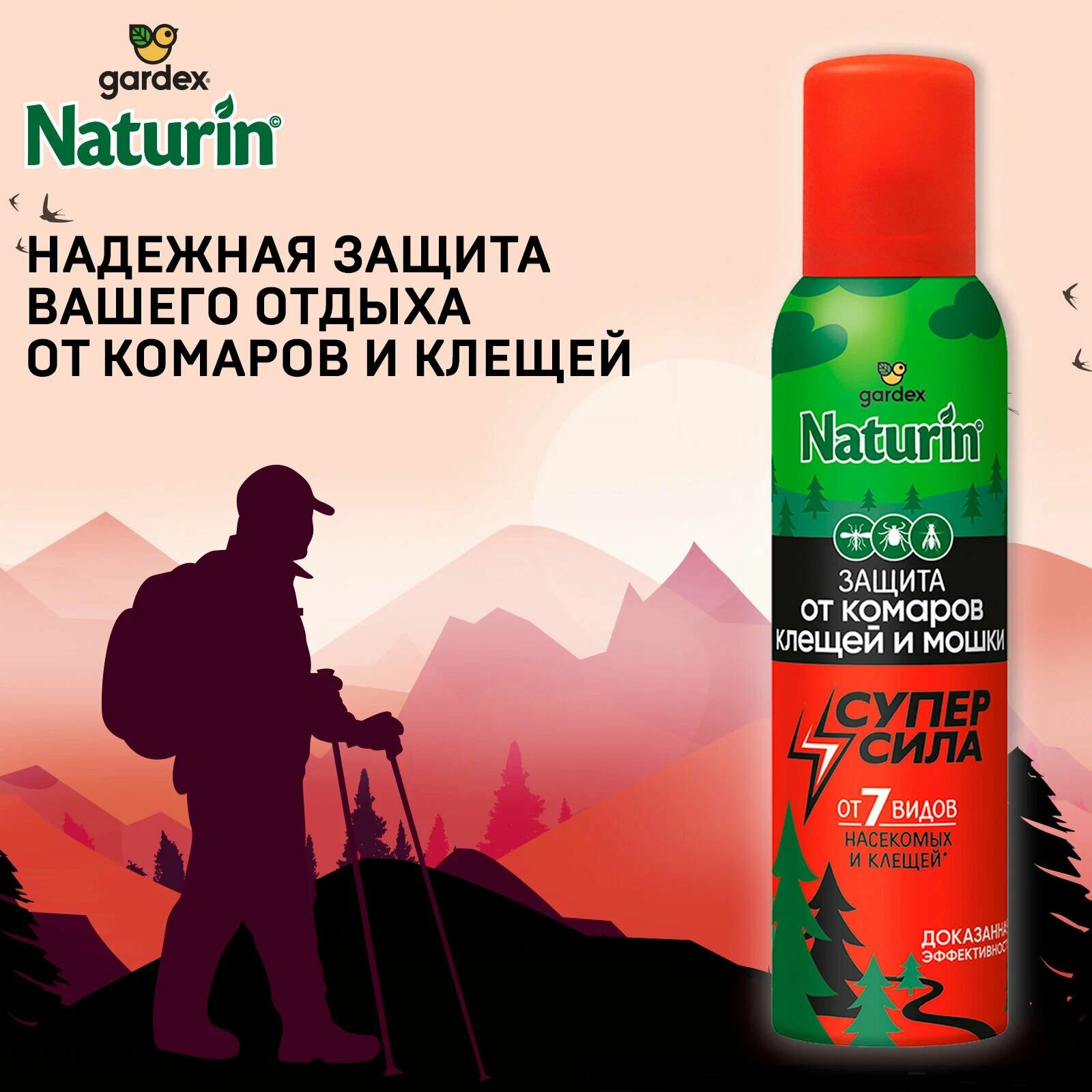 Аэрозоль Gardex Naturin Супер Сила 3 в 1 от комаров, клещей и мошки, 150 мл Защита от 7 видов насекомых и клещей