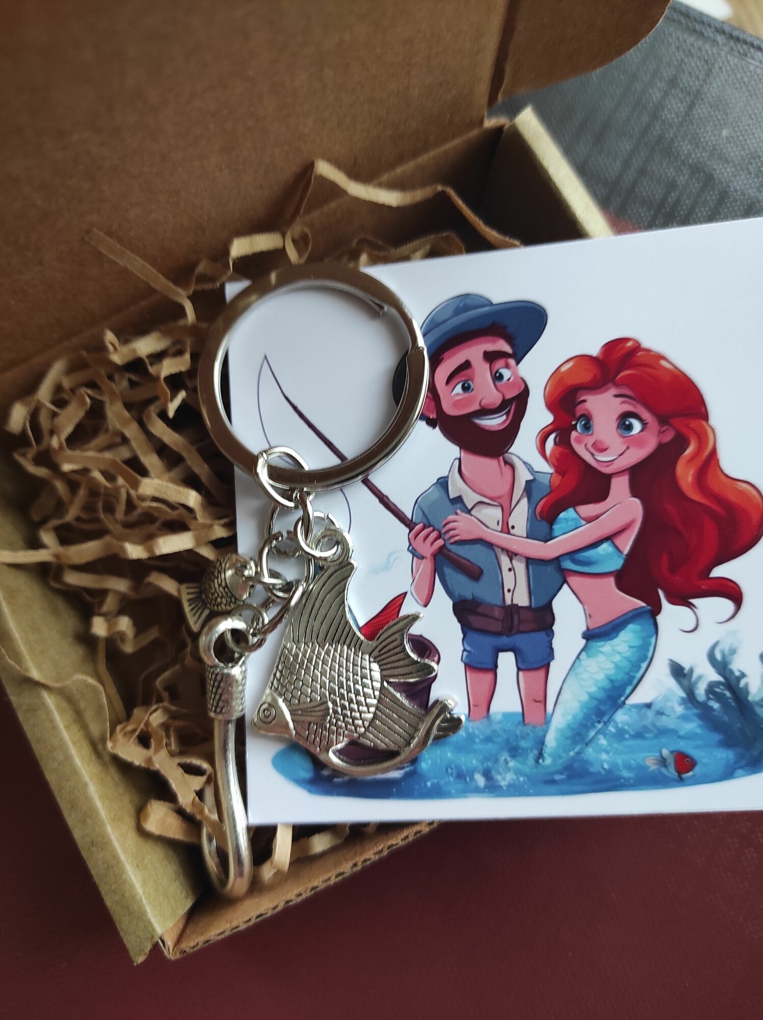 Подарок рыбаку, брелок рыбака - подарочный набор с открыткой информация: