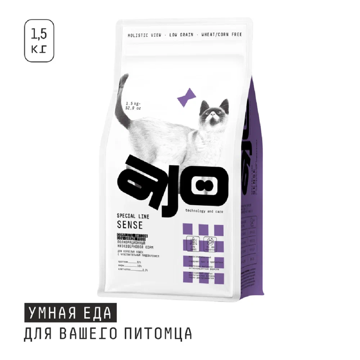 AJO Sense корм низкозерновой д/кошек с чувствительным пищеварением 1,5кг .