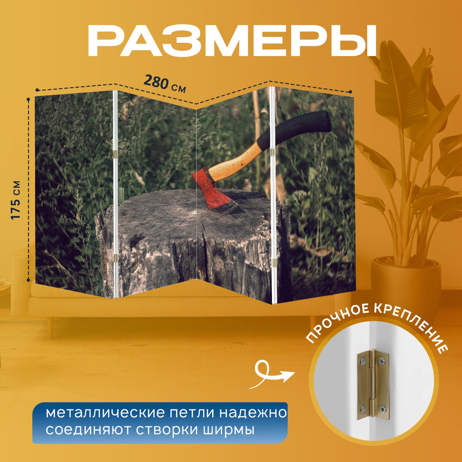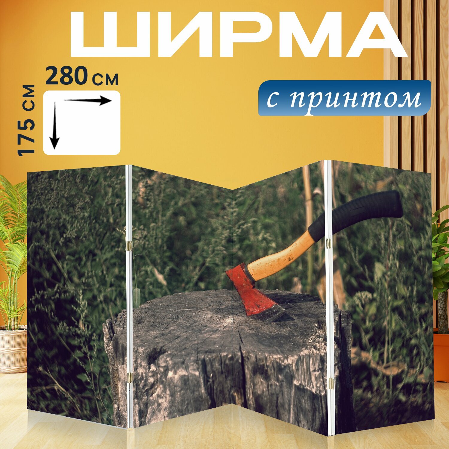 Ширма "Топор, пень, дрова" перегородка для зонирования комнаты с принтом 280x175 см. на холсте информация: