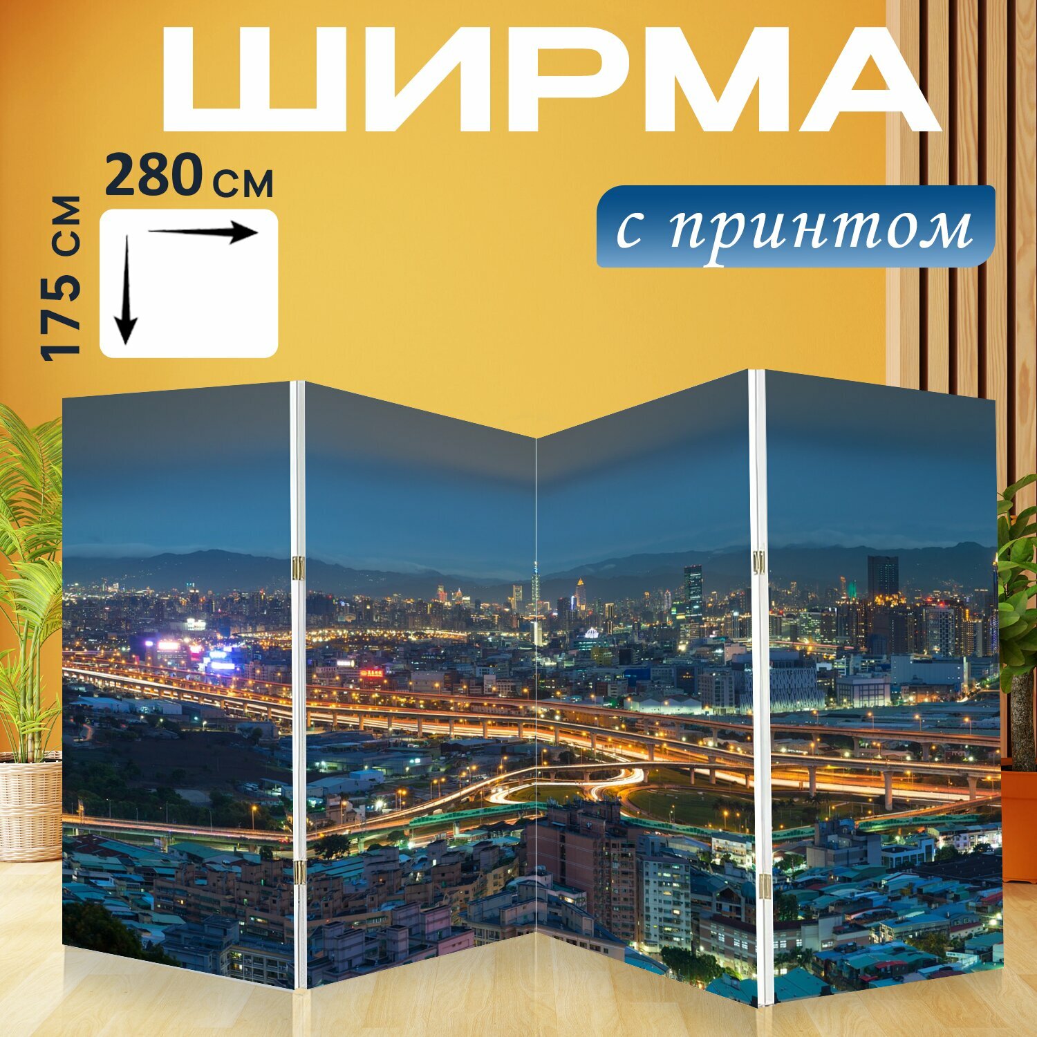10 цен на Ширма "Город, ночь, панорама" перегородка для зонирования комнаты с принтом 280x175 см. на холсте