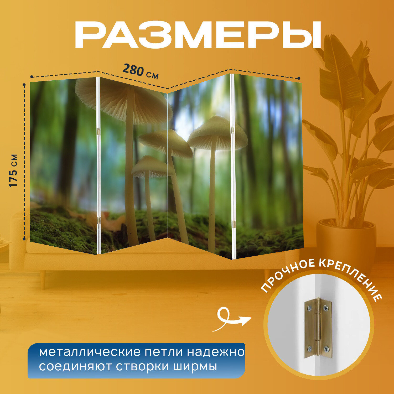 Ширма "Гриб, лес, мох" перегородка для зонирования комнаты с принтом 280x175 см. на холсте информация: