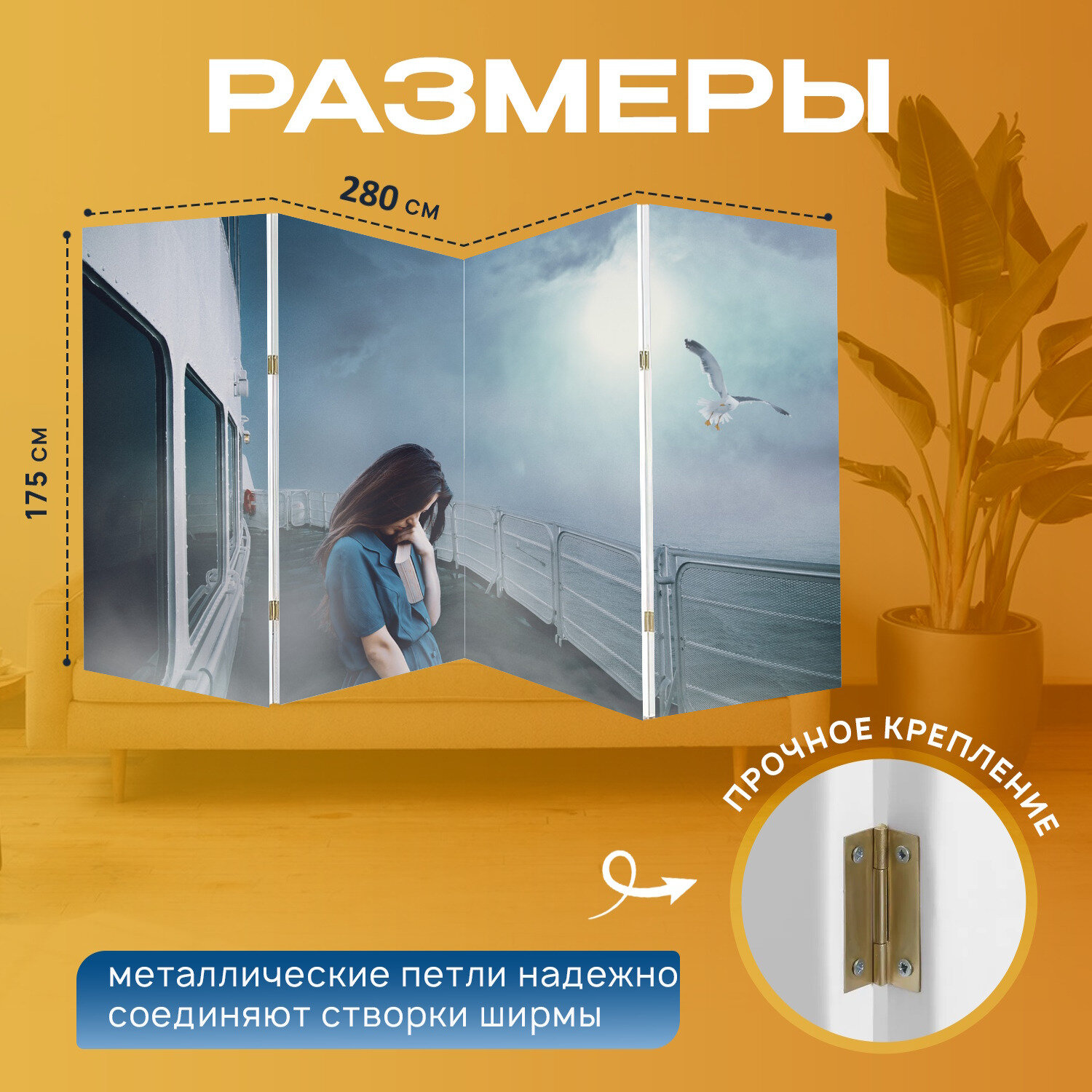 Ширма "Лодка, женщина, чайка" перегородка для зонирования комнаты с принтом 280x175 см. на холсте информация: