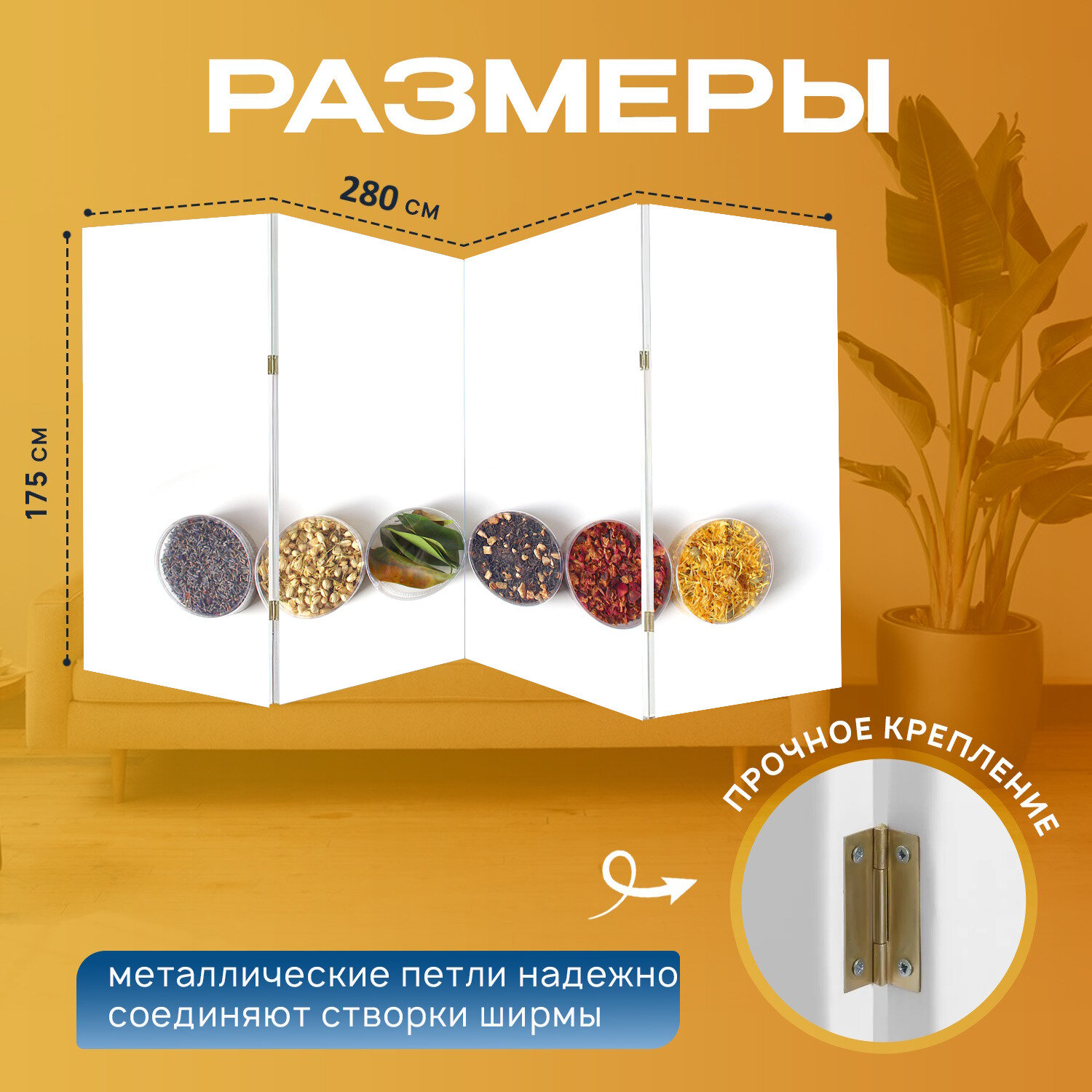 Ширма "Засушенные лепестки, сушеные листья, контейнеры" перегородка для зонирования комнаты с принтом 280x175 см. на холсте информация: