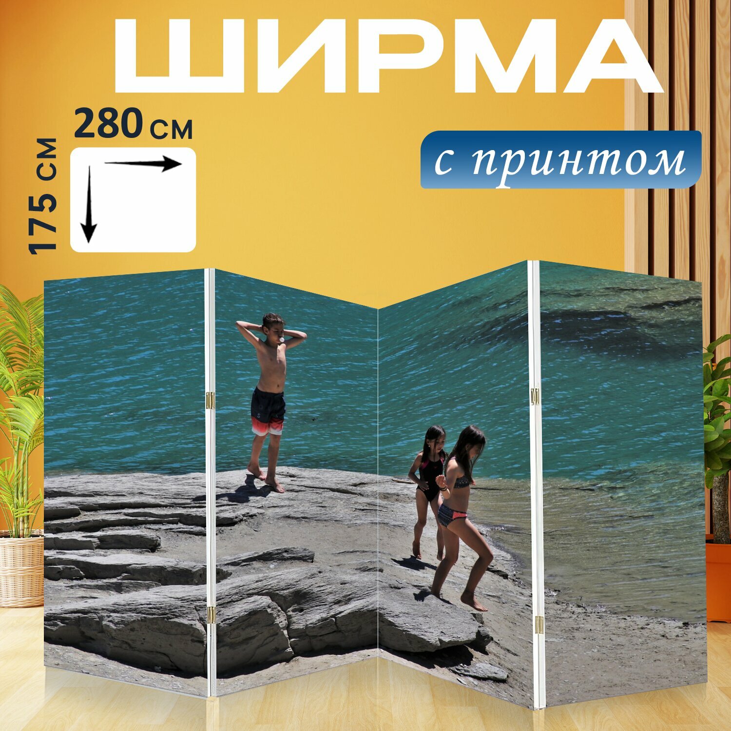 Ширма "Пляж, рок, вода" перегородка для зонирования комнаты с принтом 280x175 см. на холсте информация: