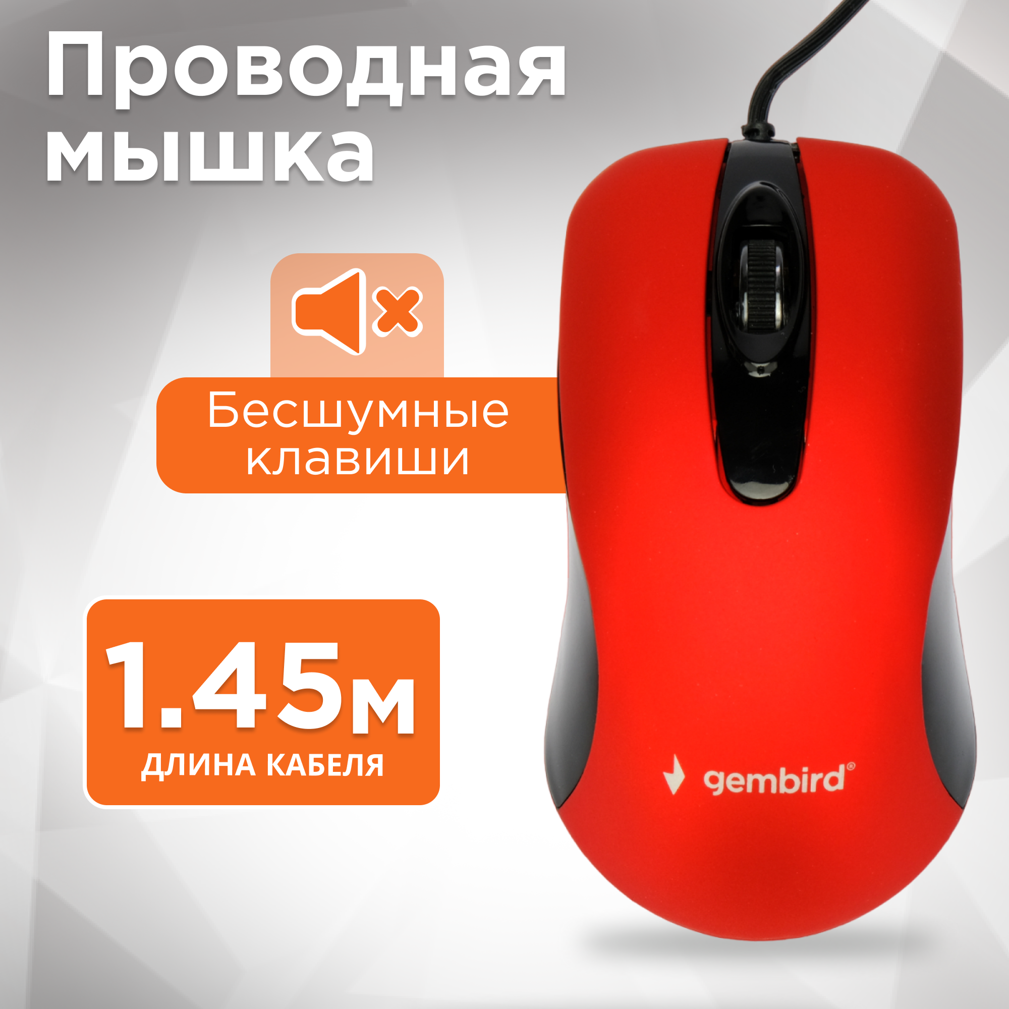 Проводная бесшумная мышь Gembird красная Soft touch 1000 DPI 1.45м MOP-400-R информация: