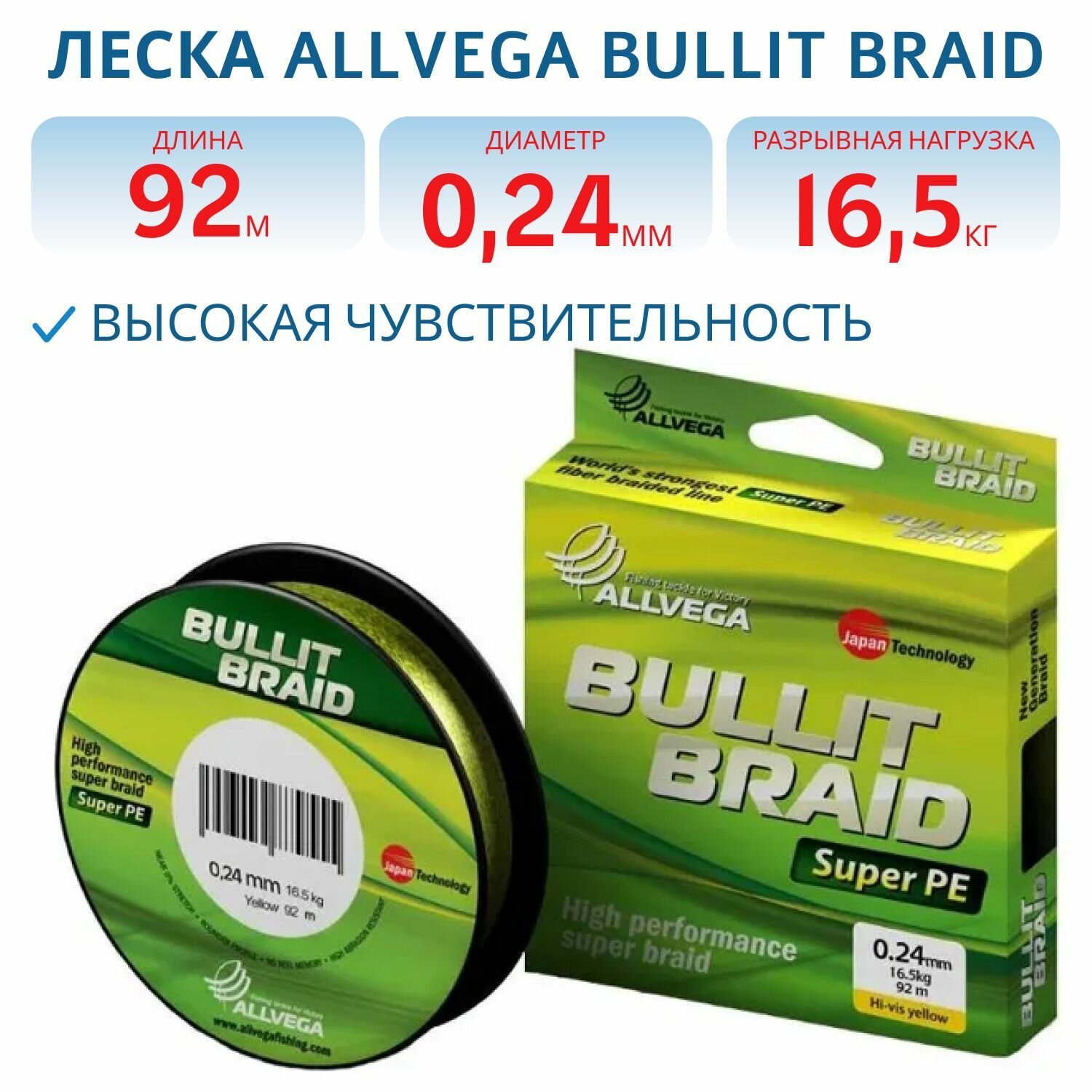 Отзывы на Леска плетеная ALLVEGA Bullit Braid 92м 0,24 мм 16,5 кг (ярко-желтая), арт.0021435