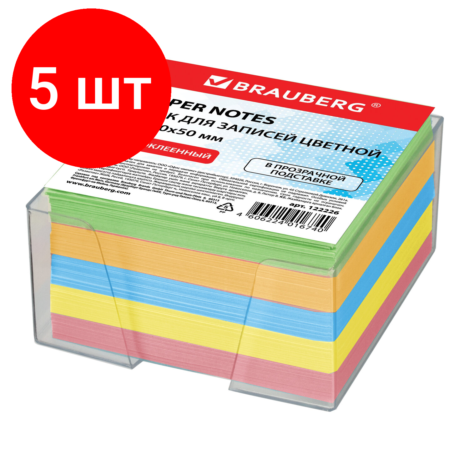 Комплект 5 шт, Блок для записей BRAUBERG в подставке прозрачной, куб 9х9х5 см, цветной, 122226 информация: