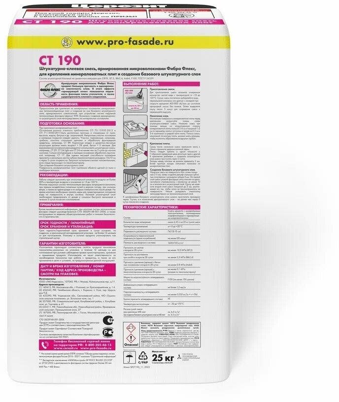 Клей СТ190 для минеральных плит, церезит - 25 кг.