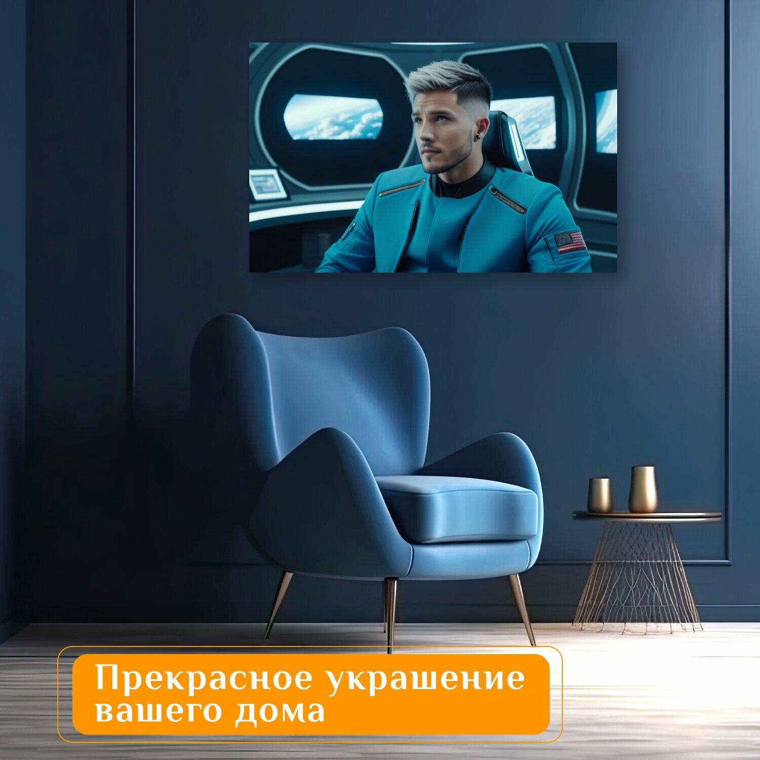 Картина на холсте в парикмахерскую "Модные стрижки в космическом корабле , " на подрамнике 75х75 см. для интерьера 2 960 ₽
