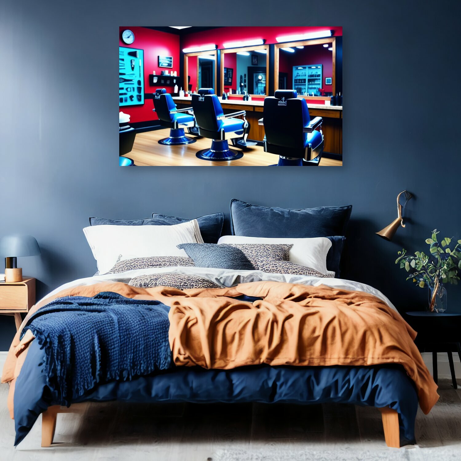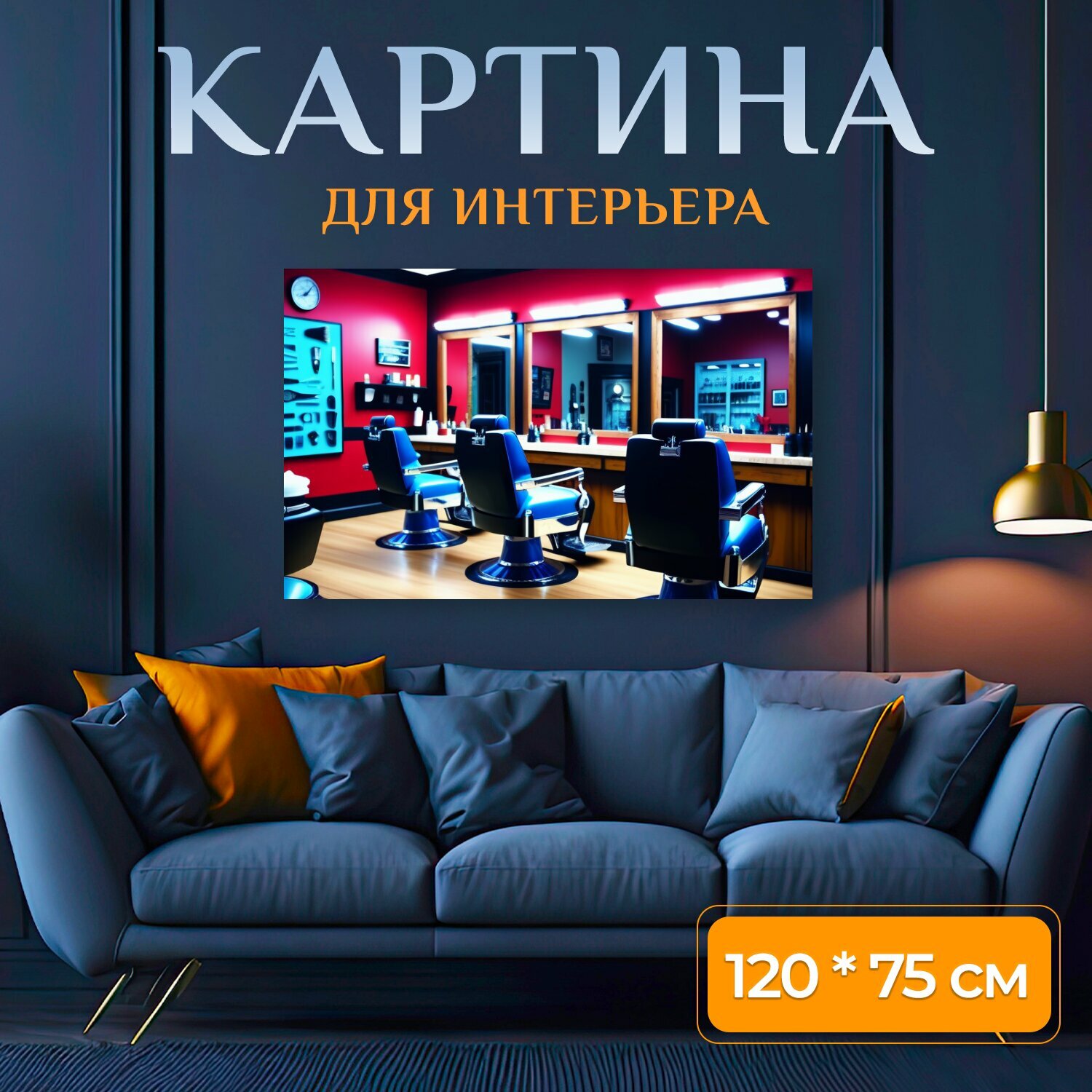10 цен на Картина на холсте в парикмахерскую "Прогулка по барбершопу , " на подрамнике 120х75 см. для интерьера