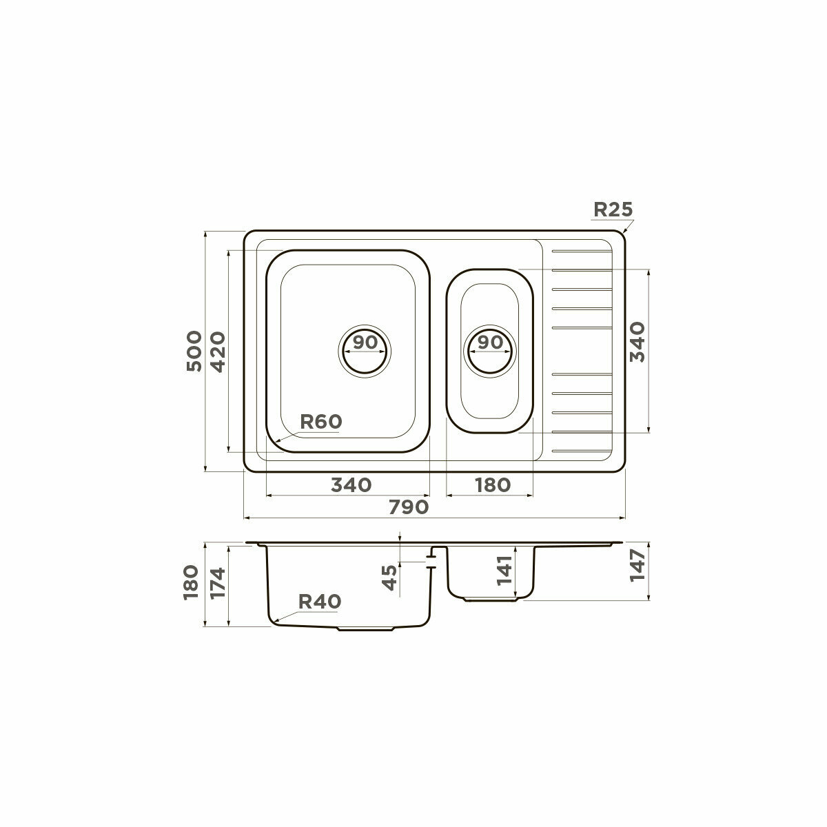 Мойка FABIA 62322L сатин врезная 78х48 см левая + большой сифон с переливом