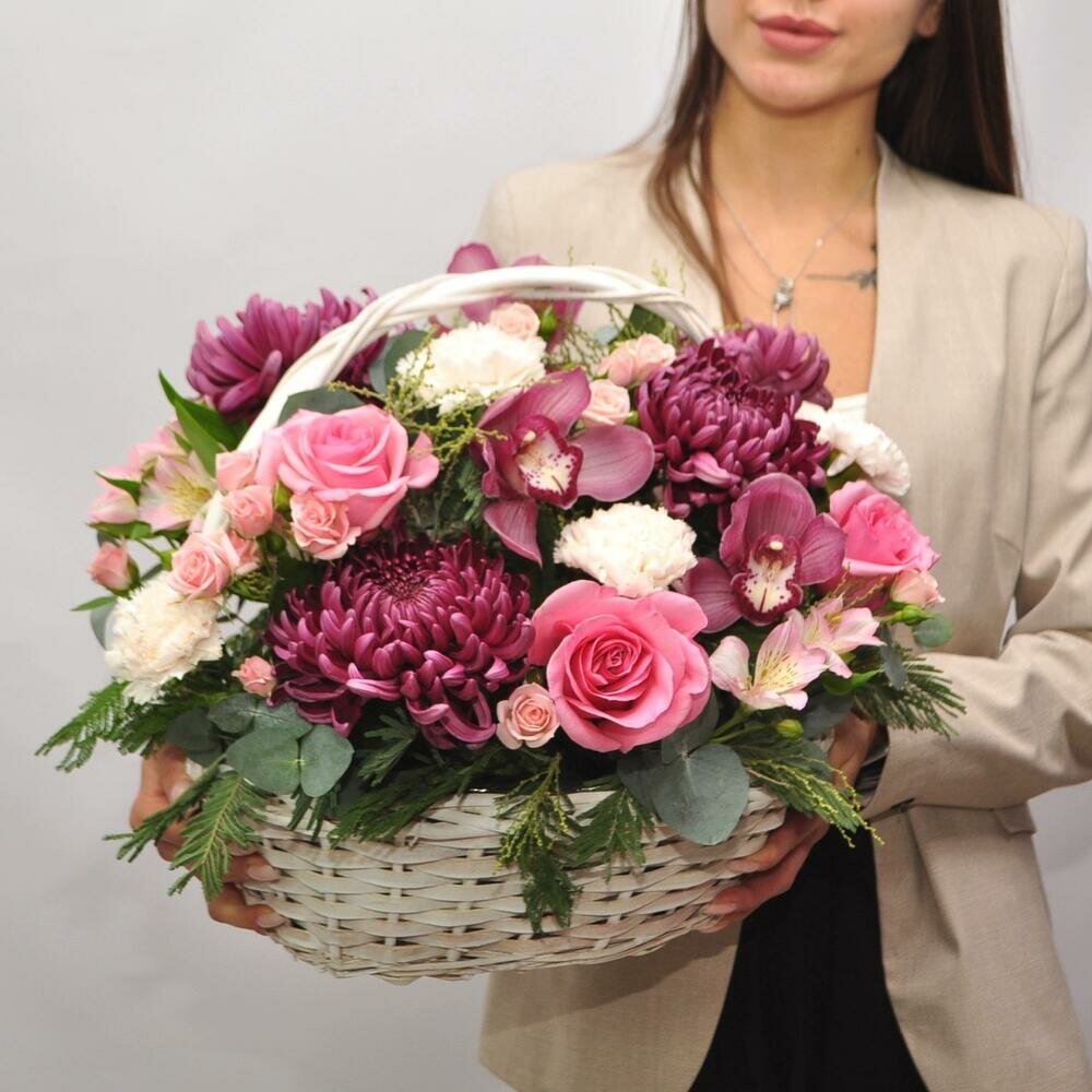 10 цен на Орхидея и хризантемы сорта Бигуди в корзине