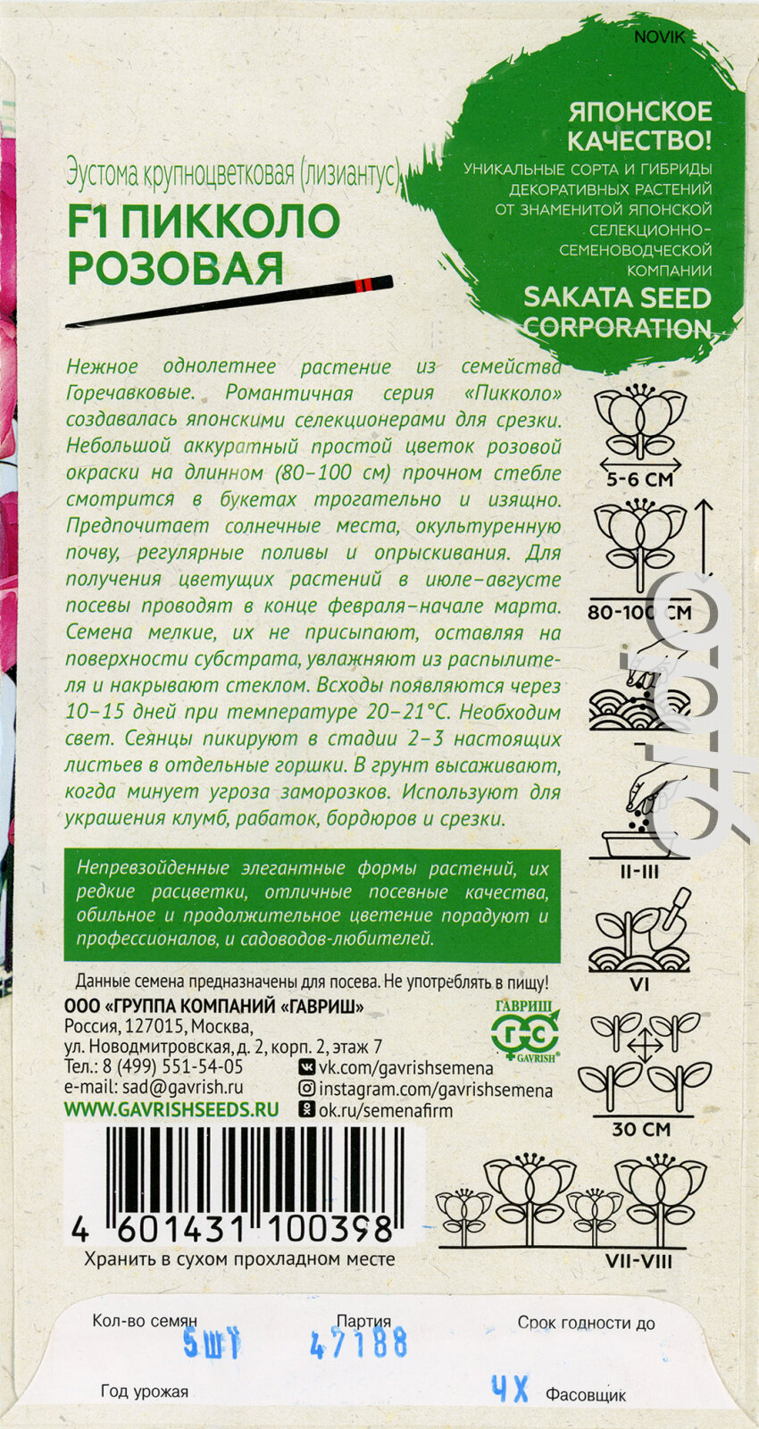 Семена Эустома Пикколо Розовая F1 5шт крупноцвет (Гавриш) Саката информация: