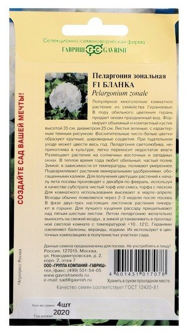 10 цен на Семена Пеларгония Бланка F1 зональная 4шт Комн 35см (Гавриш)