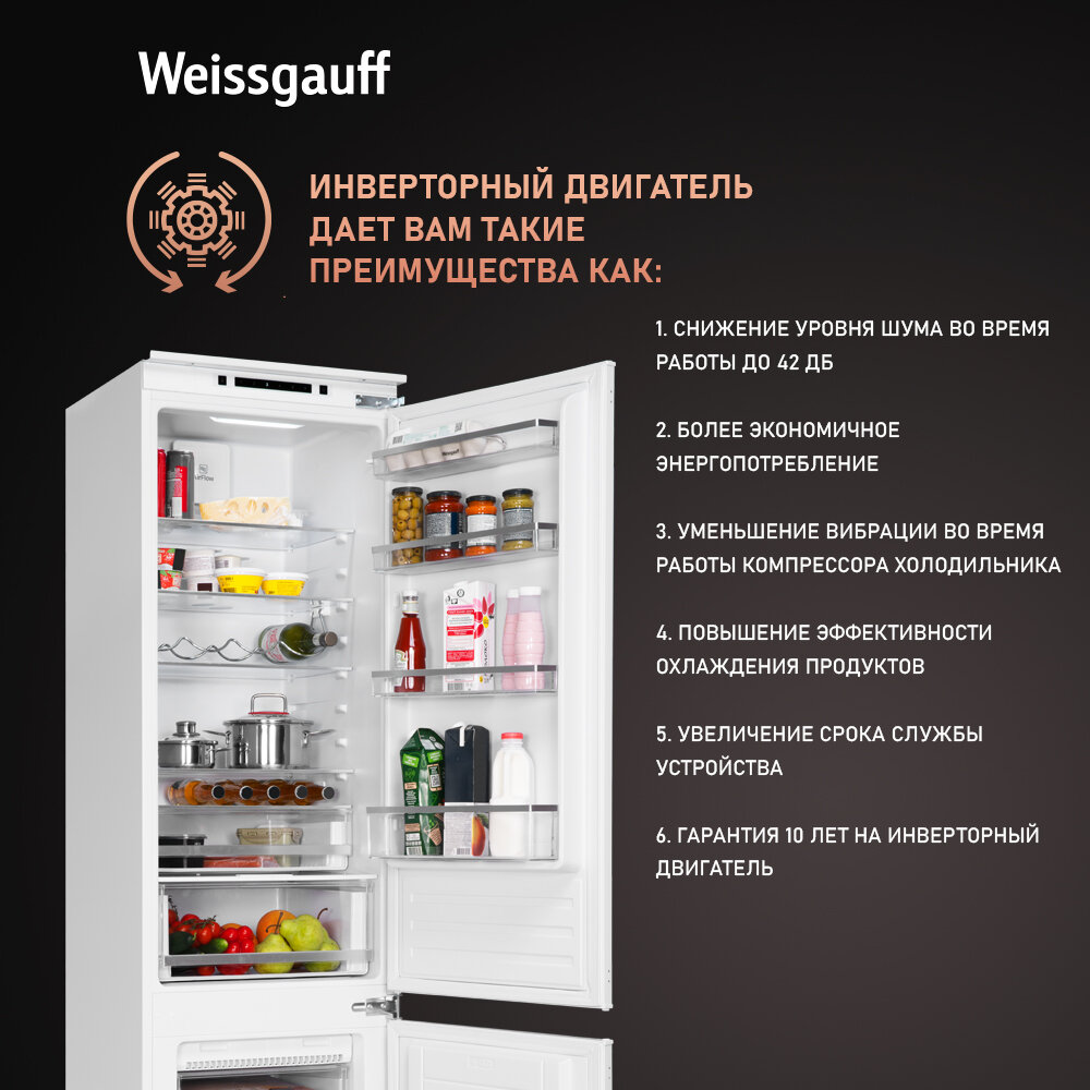 10 цен на Встраиваемый холодильник Weissgauff Wrki 195 WNF двухкамерный, 3 года гарантии, высота 193 см, ширина 54 см, No Frost в морозильной камере, зона свежести, замораживание 3 кг/сутки, слайдерное крепление фасада, бутылочница-трансформер