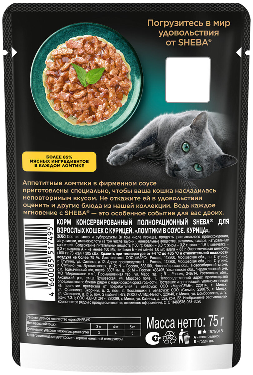 SHEBA для взрослых кошек ломтики в соусе с курицей пауч 75 гр х 5 шт информация: