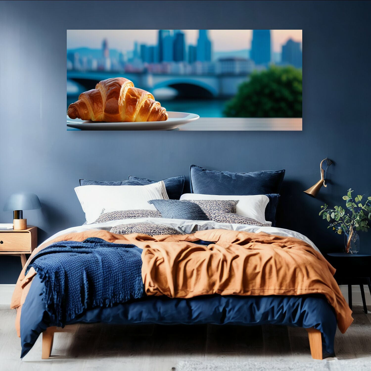 Картина на холсте "Кофе и круассан на фоне утреннего города , " на подрамнике 175х75 см. для интерьера информация: