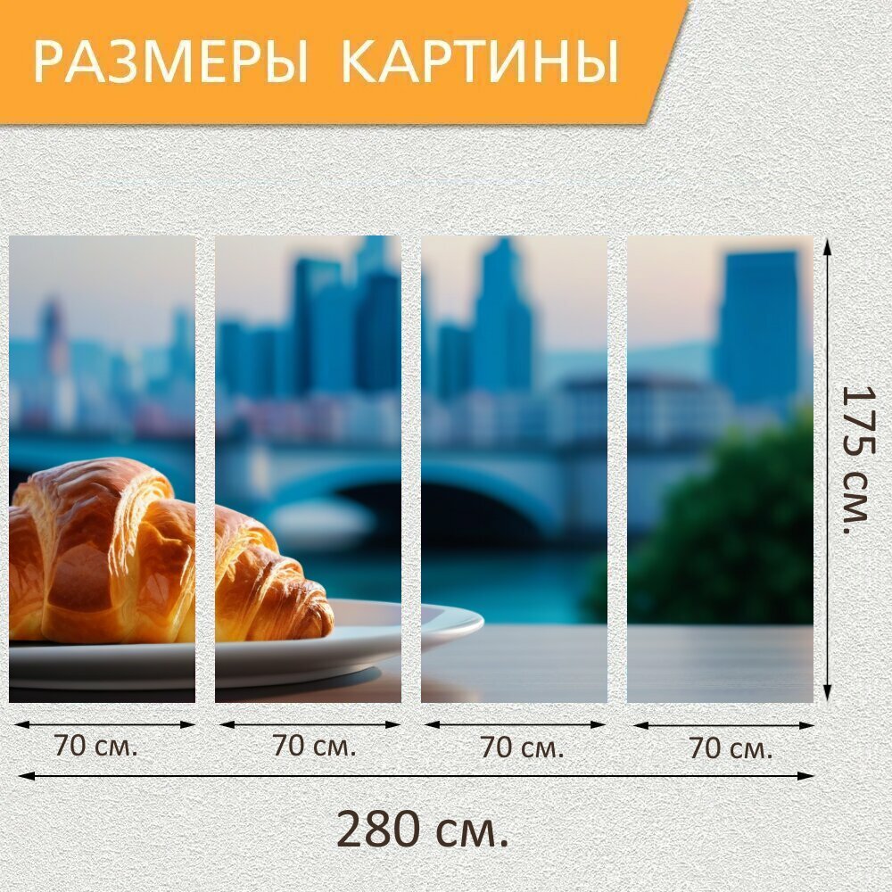 Модульная картина на холсте "Кофе и круассан на фоне утреннего города , " триптих на подрамнике 280х175 см. для интерьера информация: