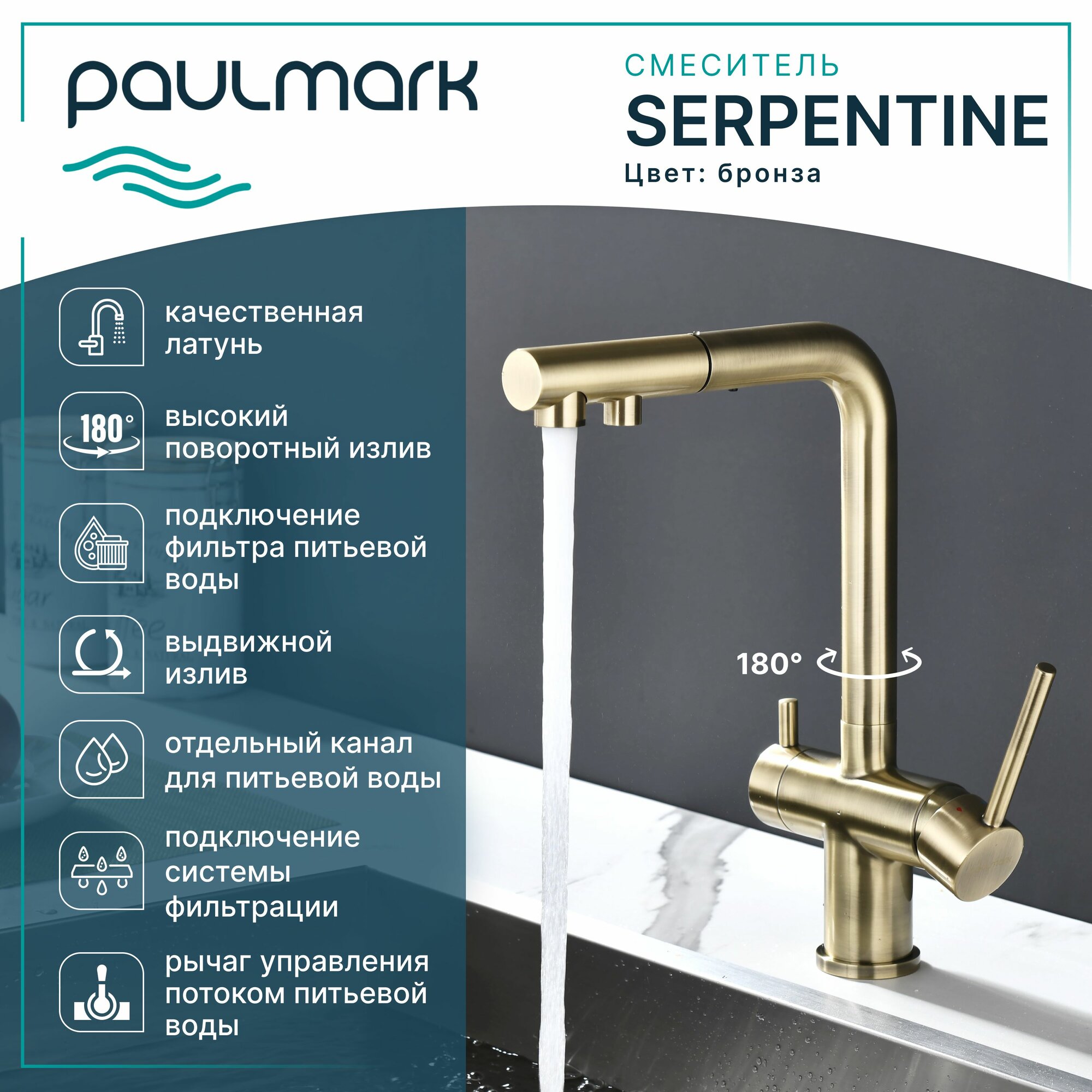 Отзывы на Кухонный смеситель с гибким выдвижным изливом Paulmark SERPENTINE, подключение к системе фильтрации воды по отдельному каналу, Г-образный, латунь, на мойку / столешницу, бронза, Se213222-BR
