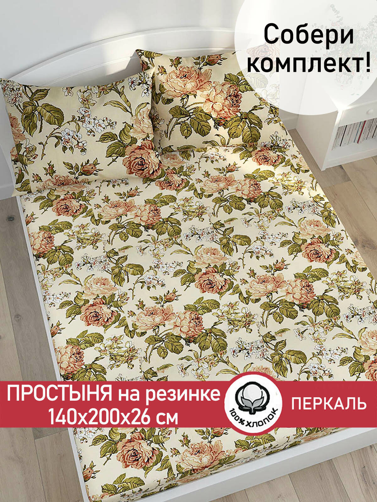 Простынь на резинке Сказка "Прохоровская роза" 140х200 см, ткань перкаль, 100% хлопок, высота 26 см информация: