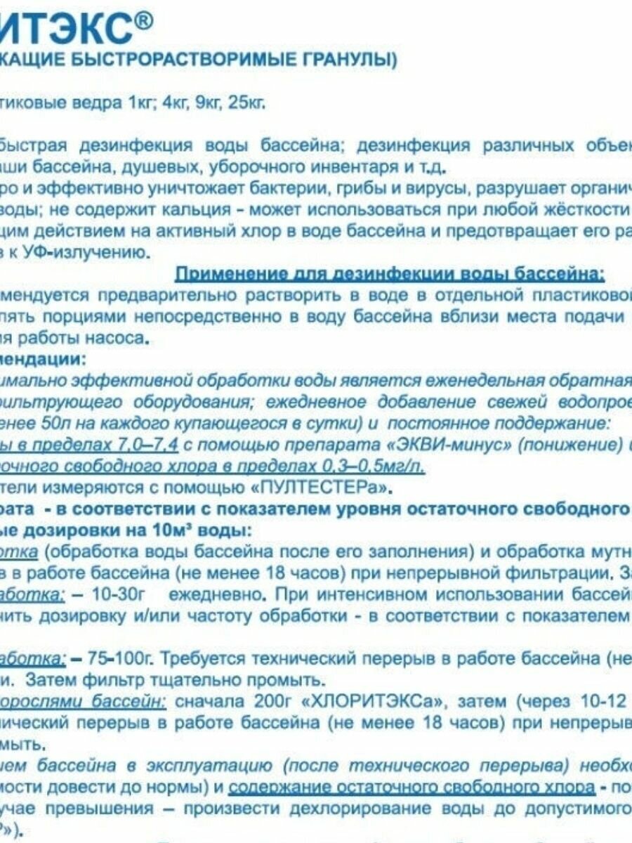 Гранулы для бассейна, Хлоритэкс 1кг, быстрорастворимый (ударный) хлор
