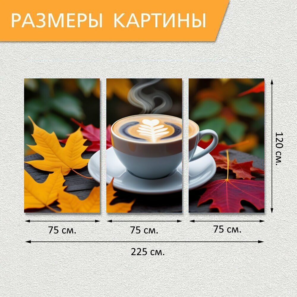 Модульная картина на холсте "Чашка кофе с уютом среди осенних листв , " триптих на подрамнике 225х120 см. для интерьера информация: