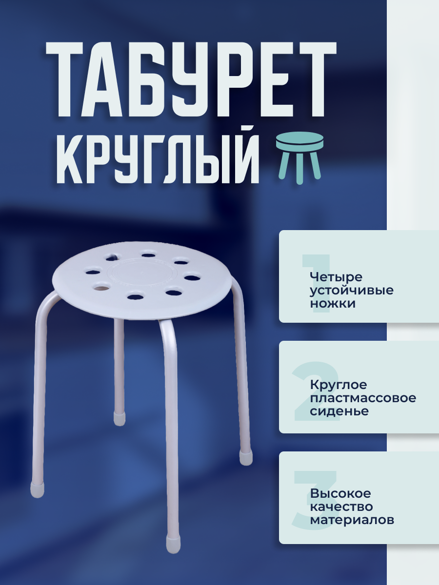 Табурет твердый круглое сидение, нагрузка до 100 кг, 4 опоры, серый (Ника)