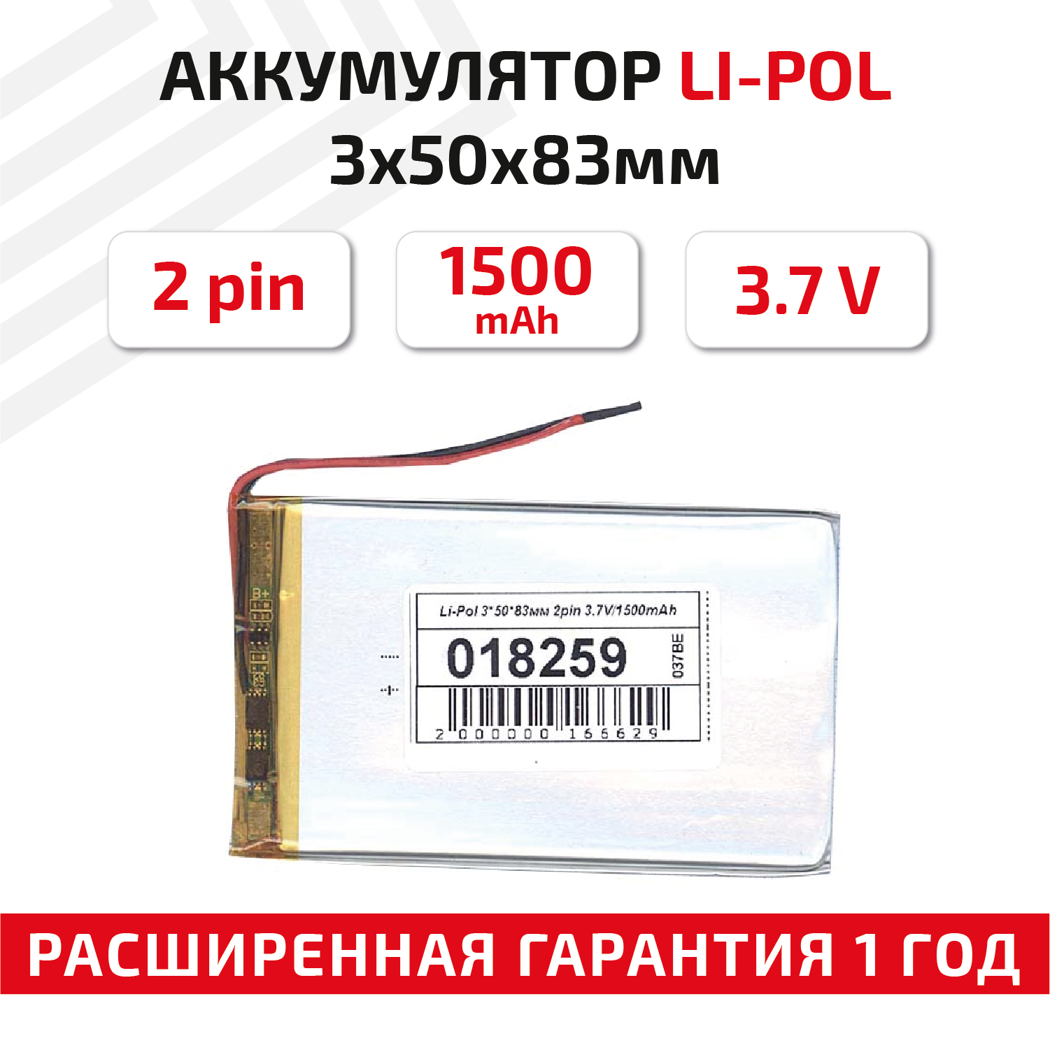 10 цен на Универсальный аккумулятор (АКБ) для планшета, видеорегистратора и др, 3х50х83мм, 1500мАч, 3.7В, Li-Pol, 2pin (на 2 провода)