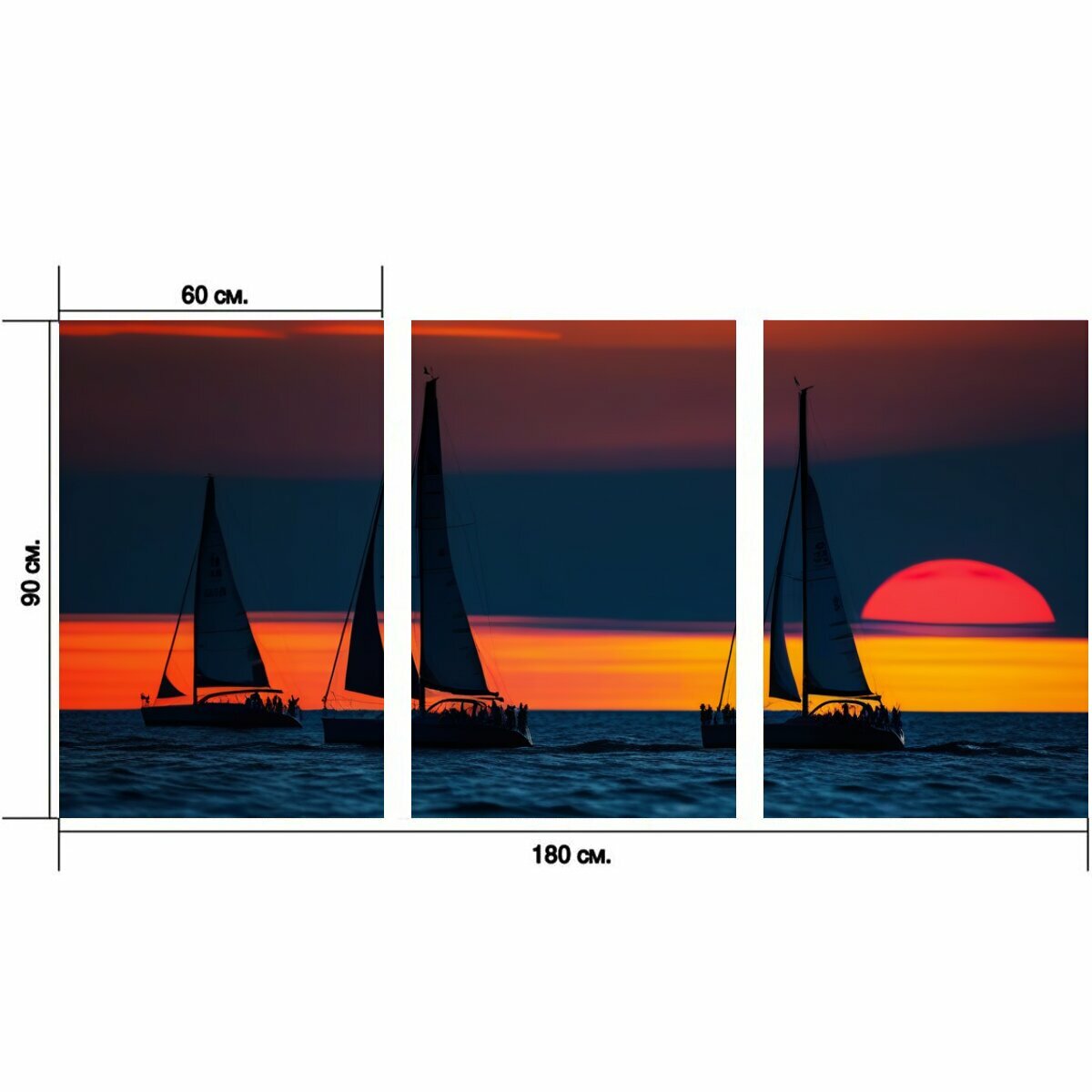 Модульный постер "Парусники на фоне заката" 180 x 90 см. для интерьера на стену информация: