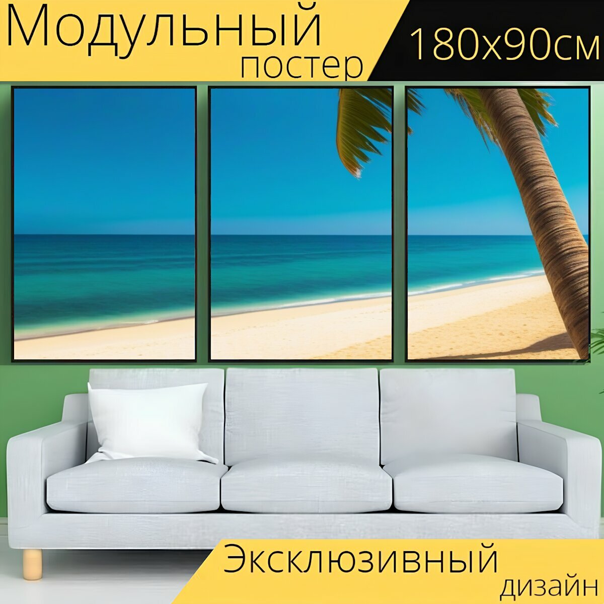Модульный постер "Серфинг на пляже с наклонной пальмой" 180 x 90 см. для интерьера на стену информация: