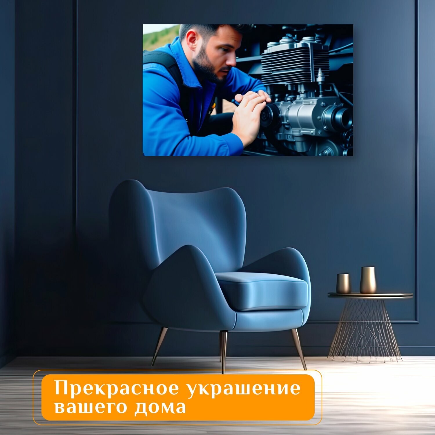 Картина на холсте в автосервис "Механик слушает двигатель внедорожника , " на подрамнике 75х75 см. для интерьера 2 950 ₽
